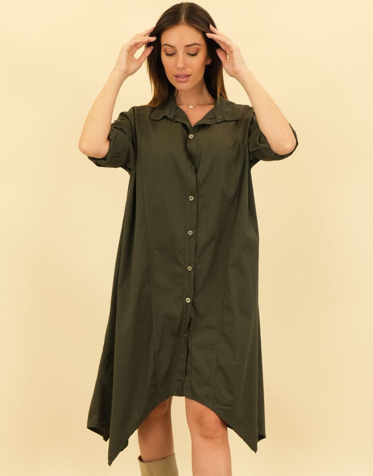 Elöl gombos, bő szabású ingruha elasztikus pamutvászonból. Alsó része cikk-cakkos kialakítású, így minden testmagassághoz illik. Vastag övvel viselve hangsúlyozhatod derekad, vagy sportossá teheted egy sneakerrel.