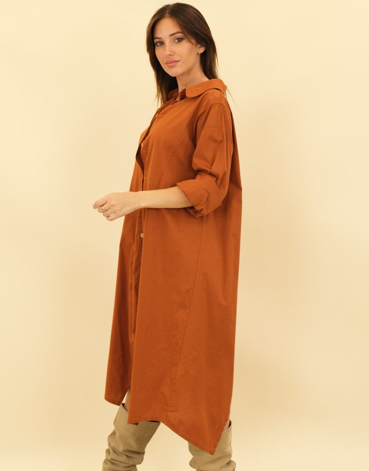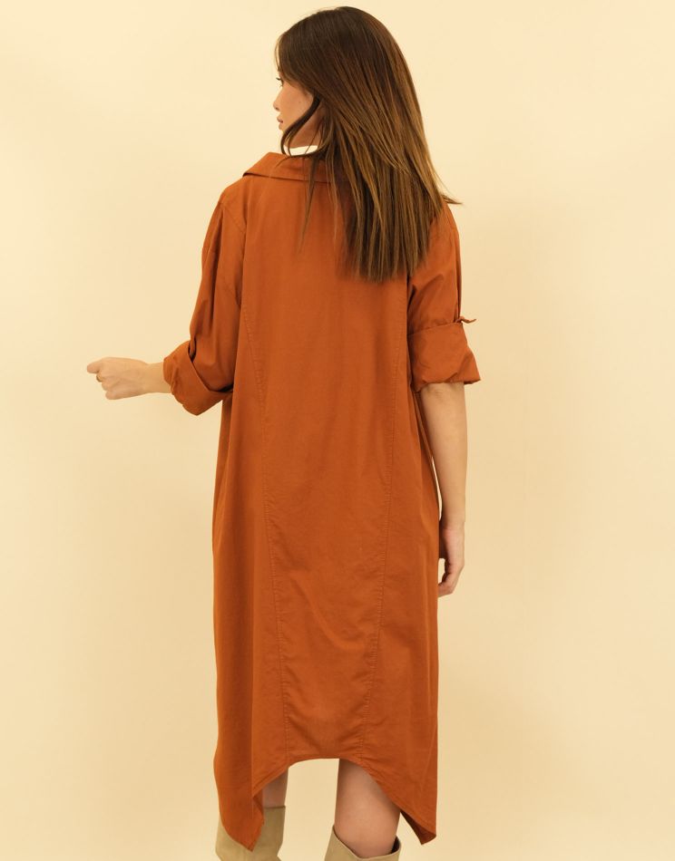 Elöl gombos, bő szabású ingruha elasztikus pamutvászonból. Alsó része cikk-cakkos kialakítású, így minden testmagassághoz illik. Vastag övvel viselve hangsúlyozhatod derekad, vagy sportossá teheted egy sneakerrel.